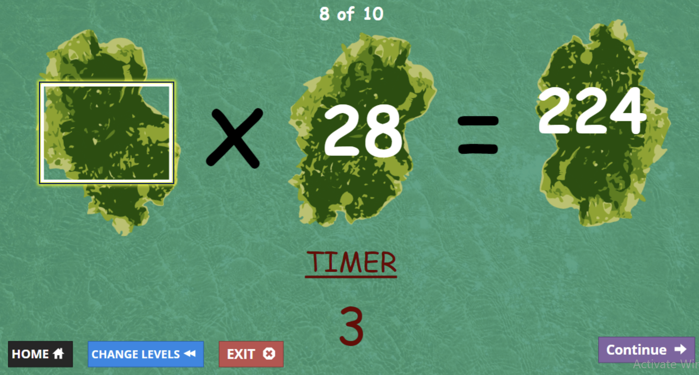 Select a difficulty level: Easy, Medium and Difficult. Difficult has a 5 second time limit. Fill in the space with the correct number to complete the addition equation. Press the purple "Continue" button to progress. A wrong answer will not let you progress. Keep going until you complete all 10 equations. Have fun!
